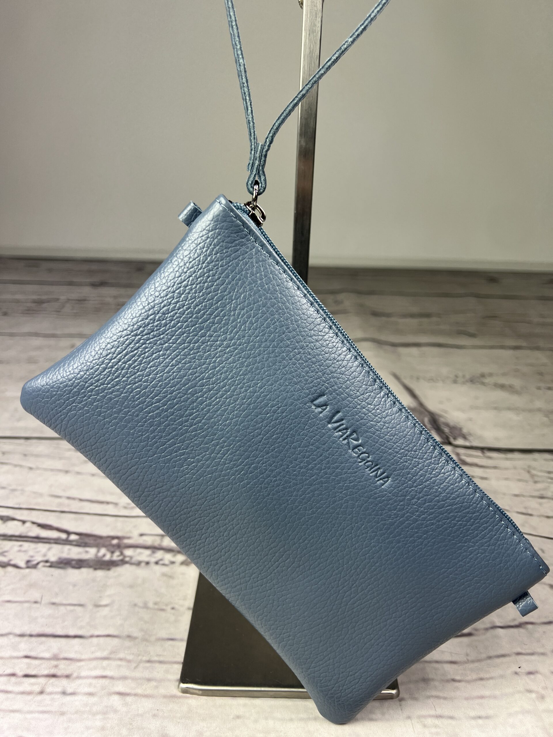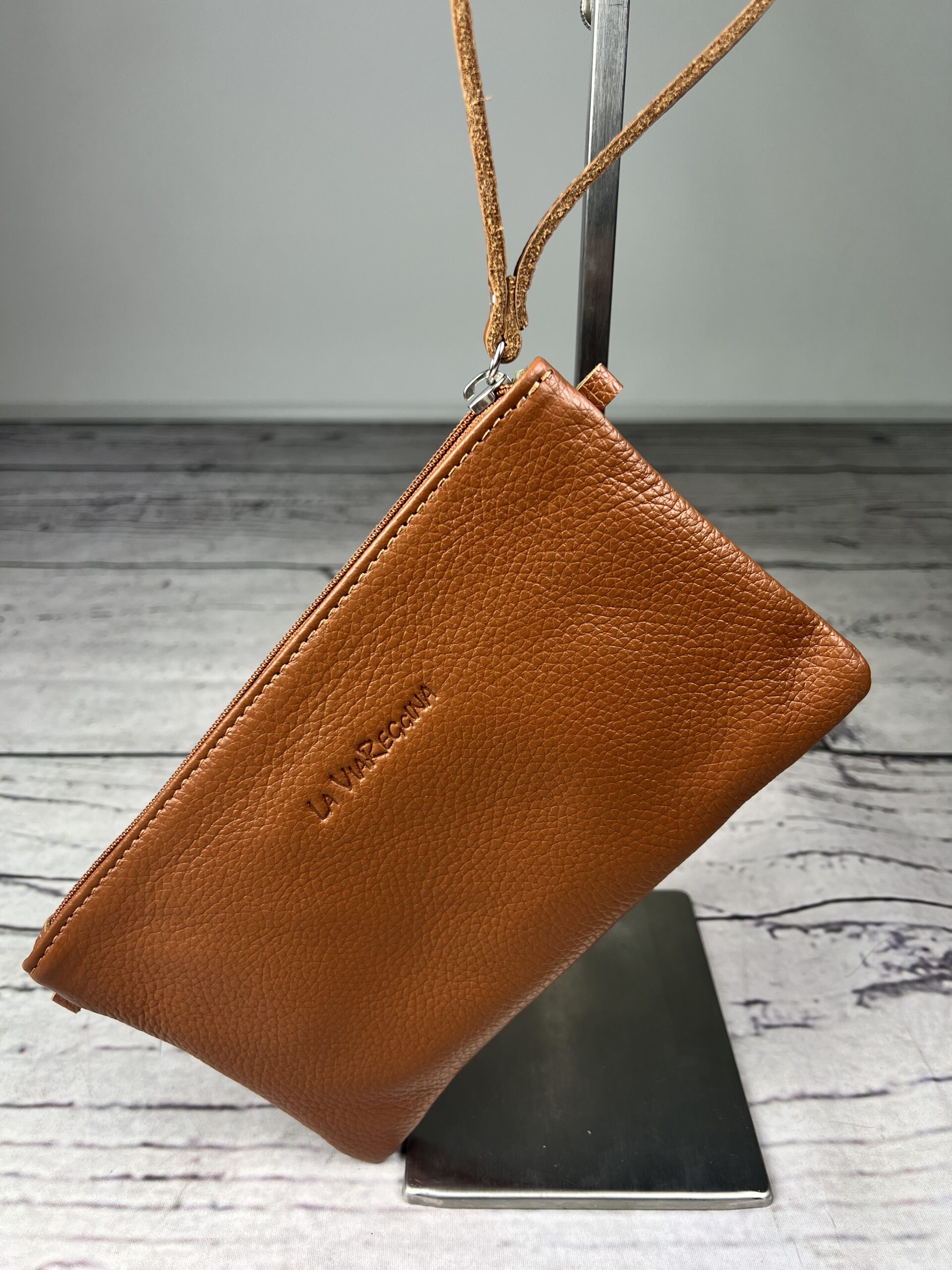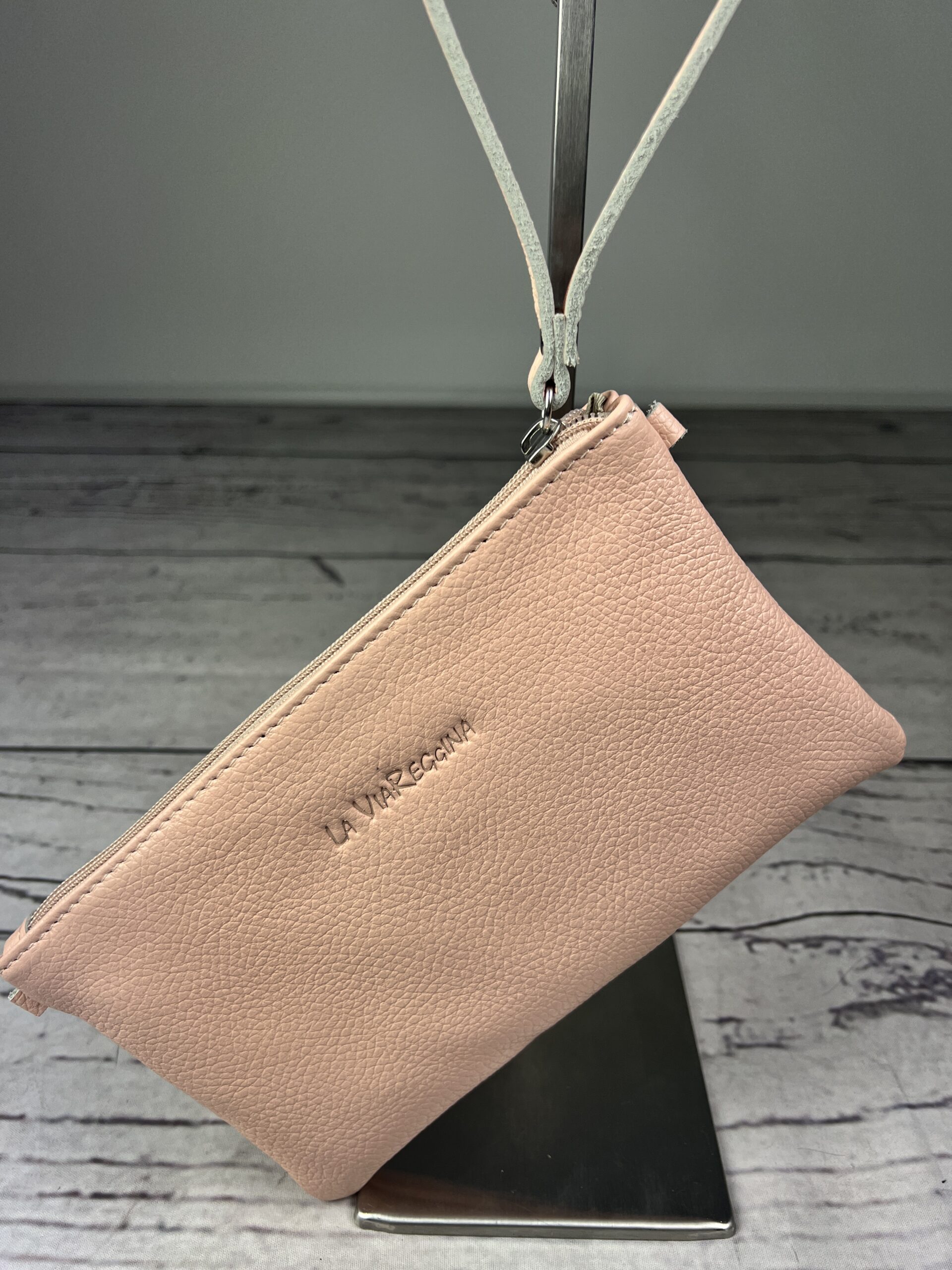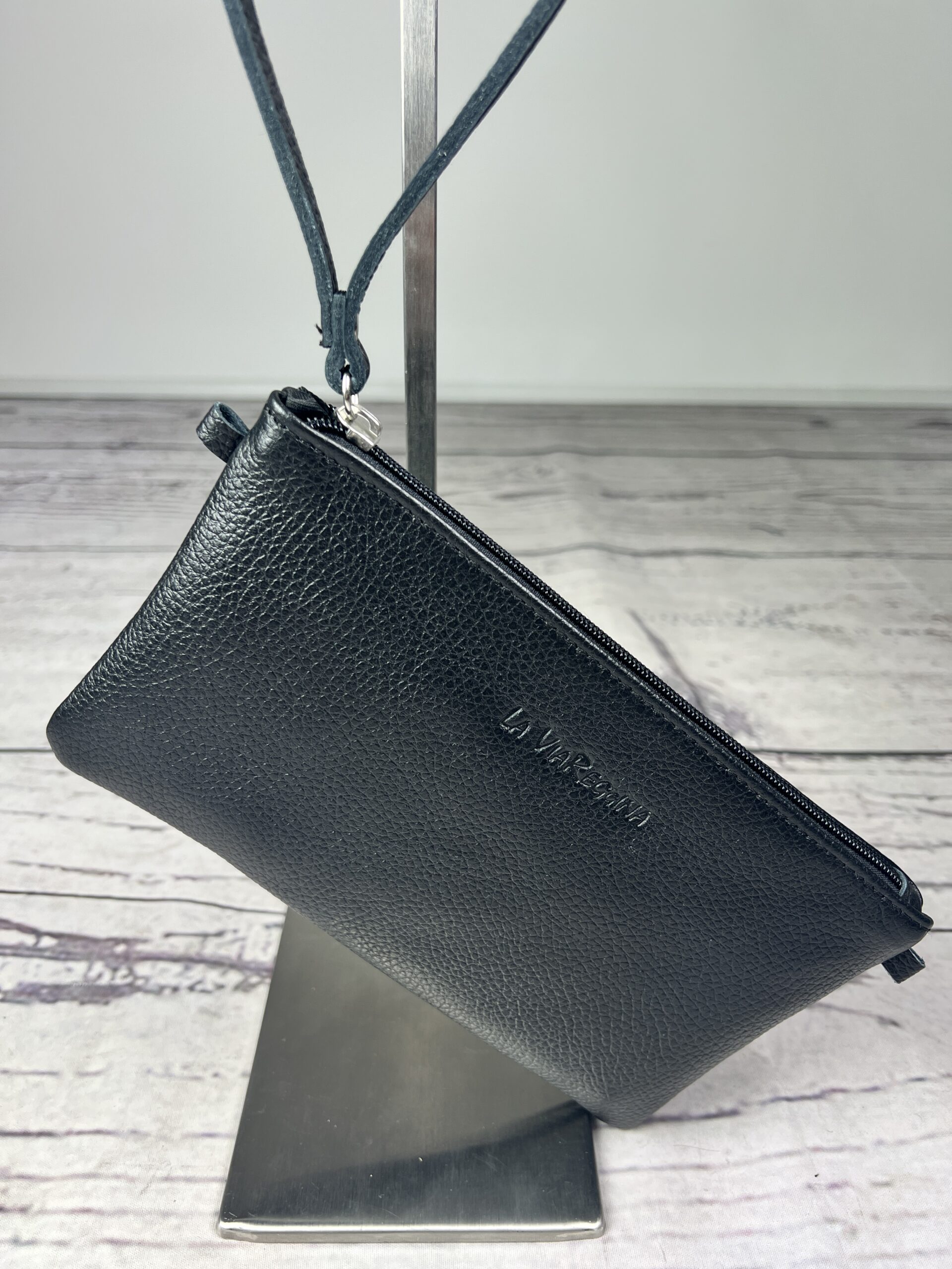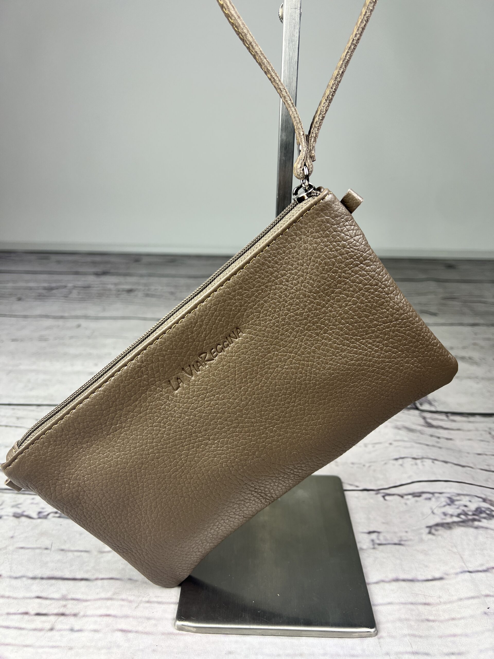 Pochette in vera morbida pelle con zip e pratica tracolla, firnata La Viareggina. Misure 22x13cm