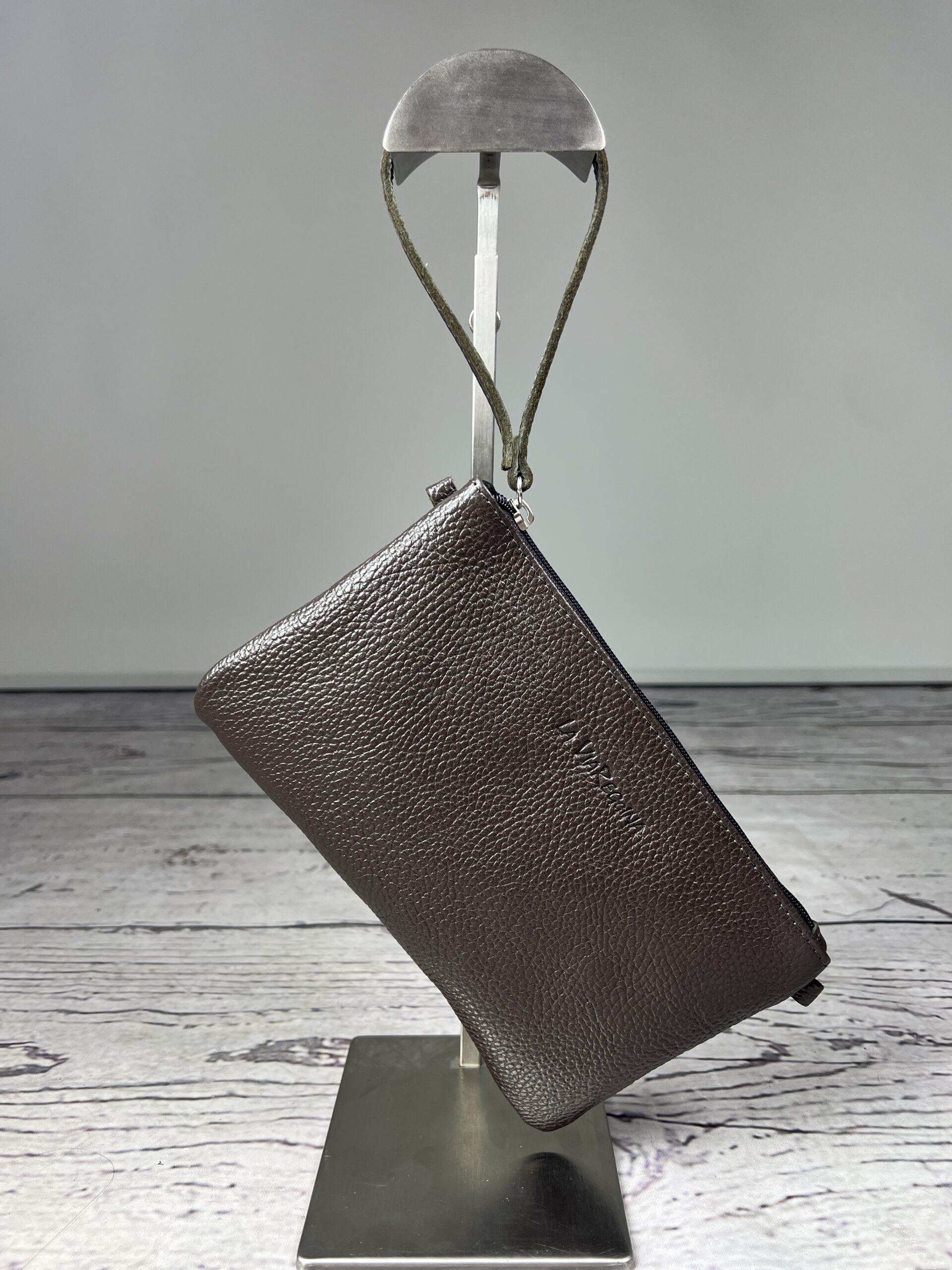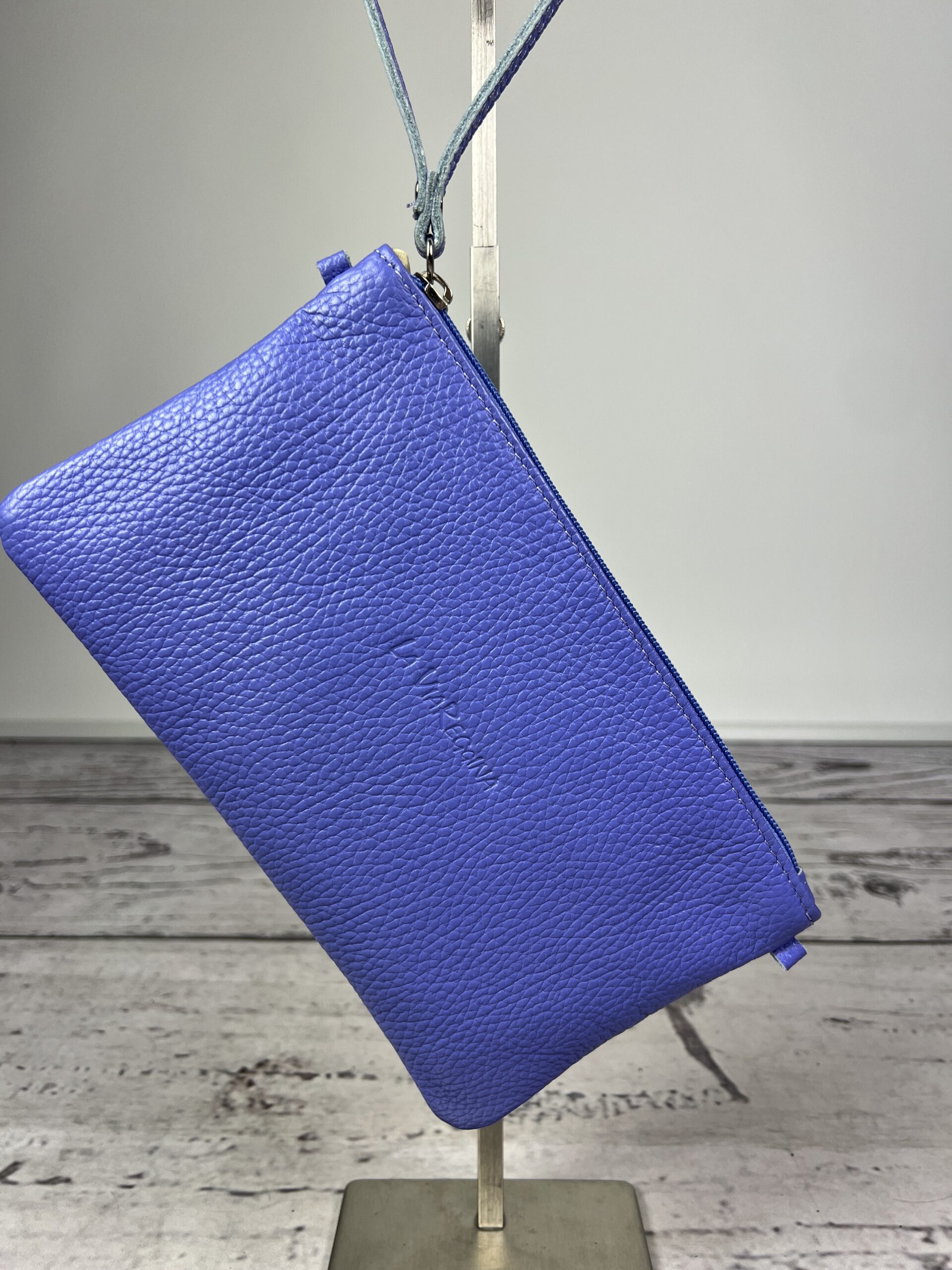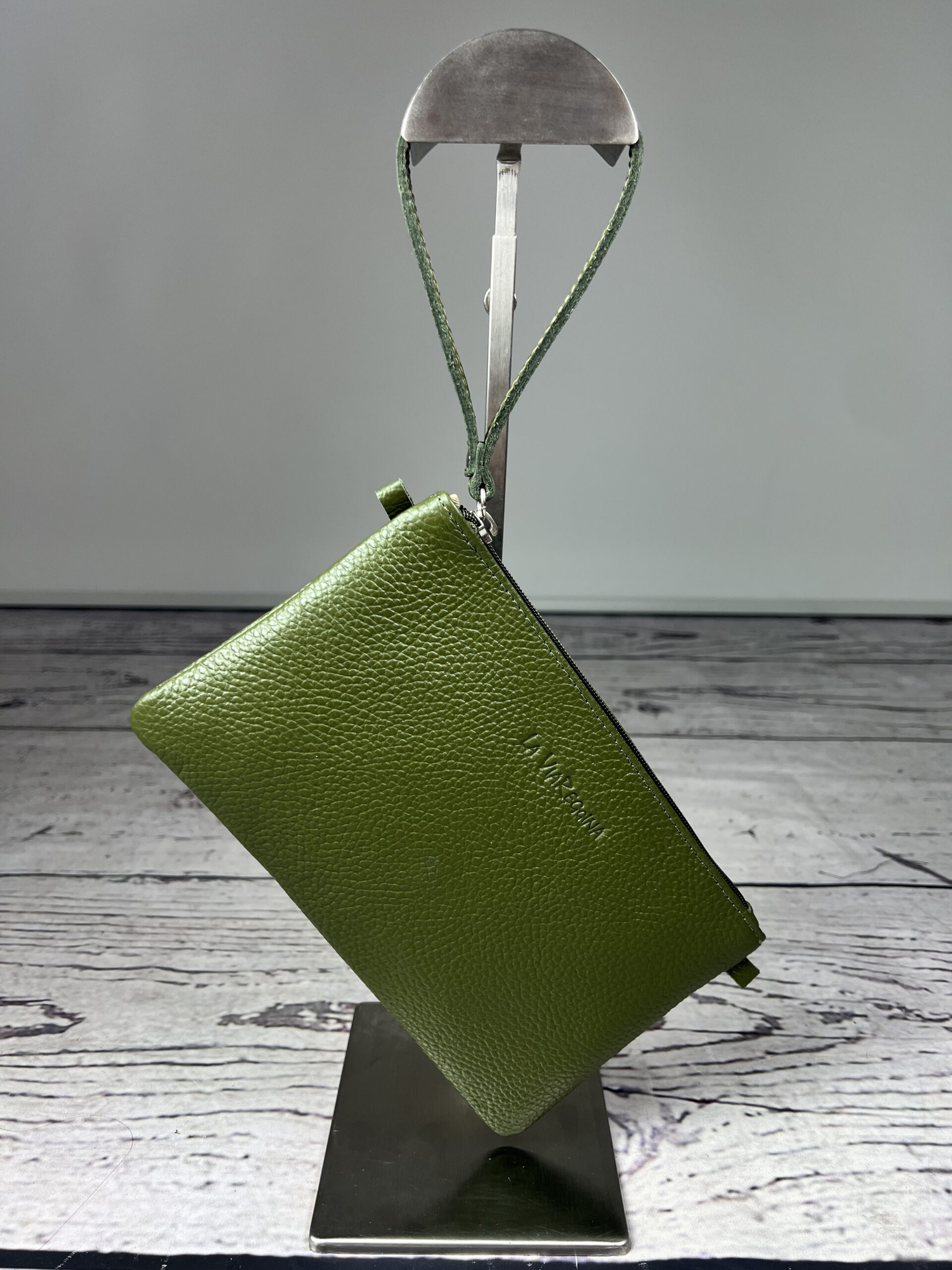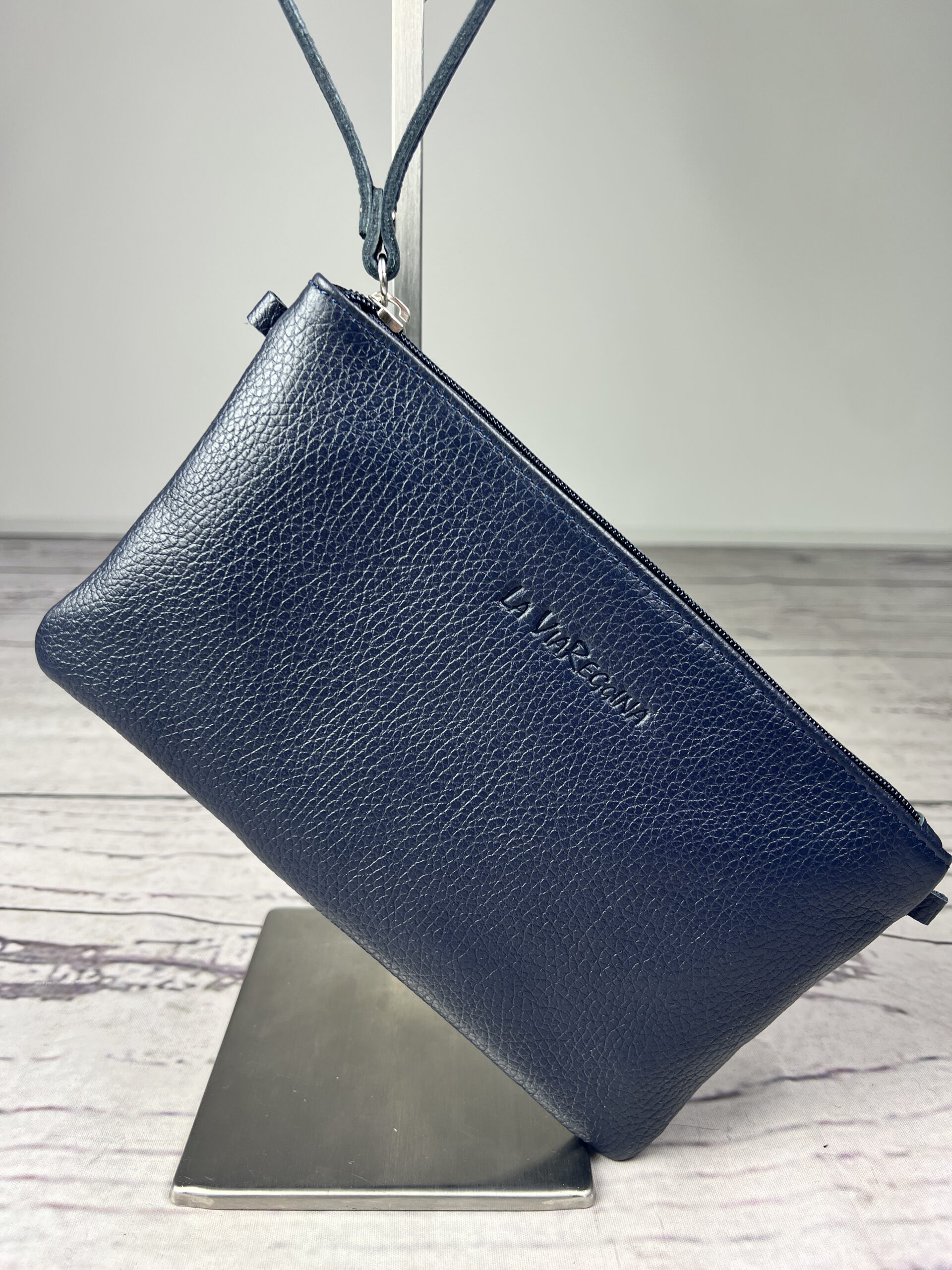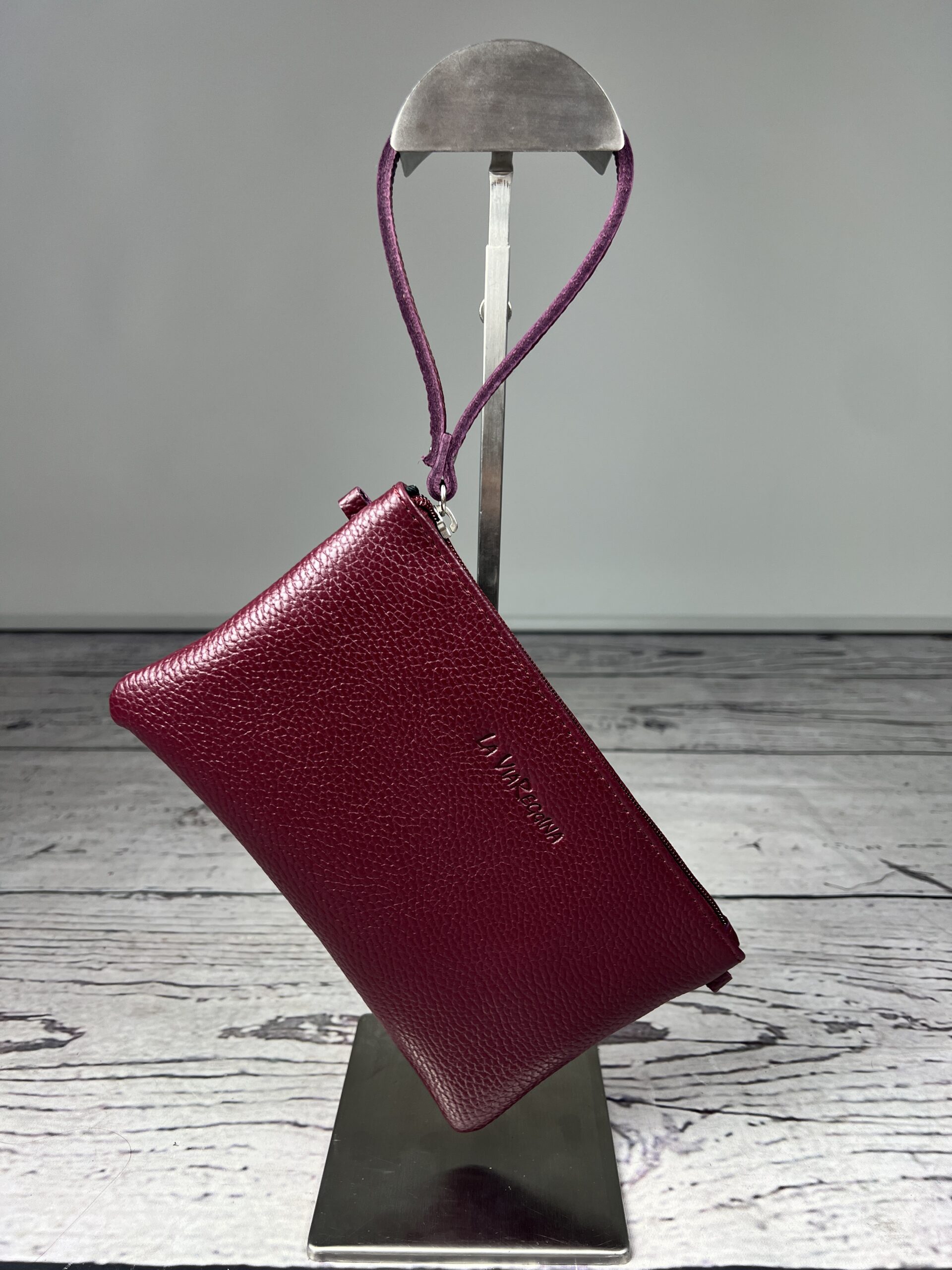 Pochette in vera morbida pelle con zip e pratica tracolla, firnata La Viareggina. Misure 22x13cm
