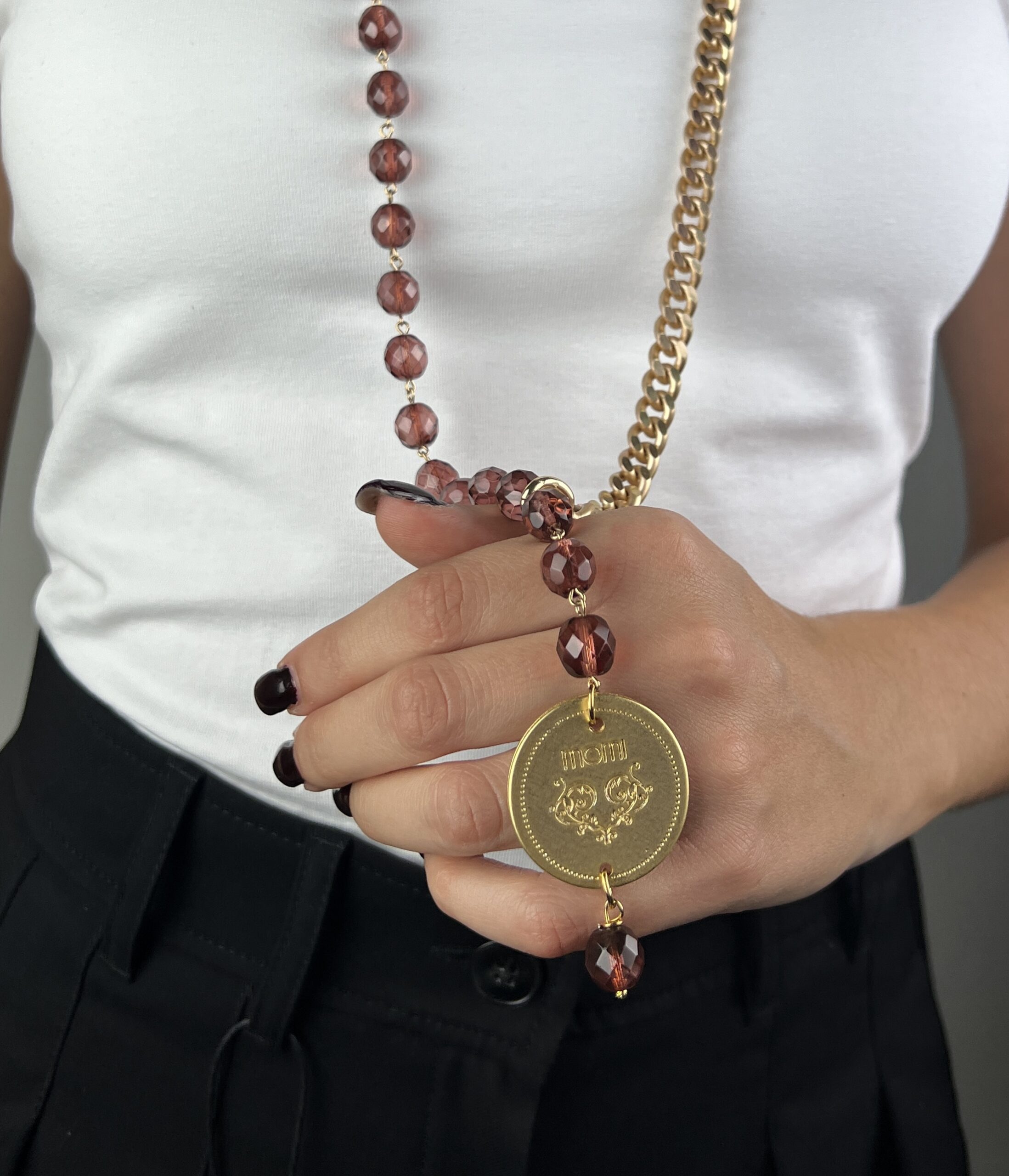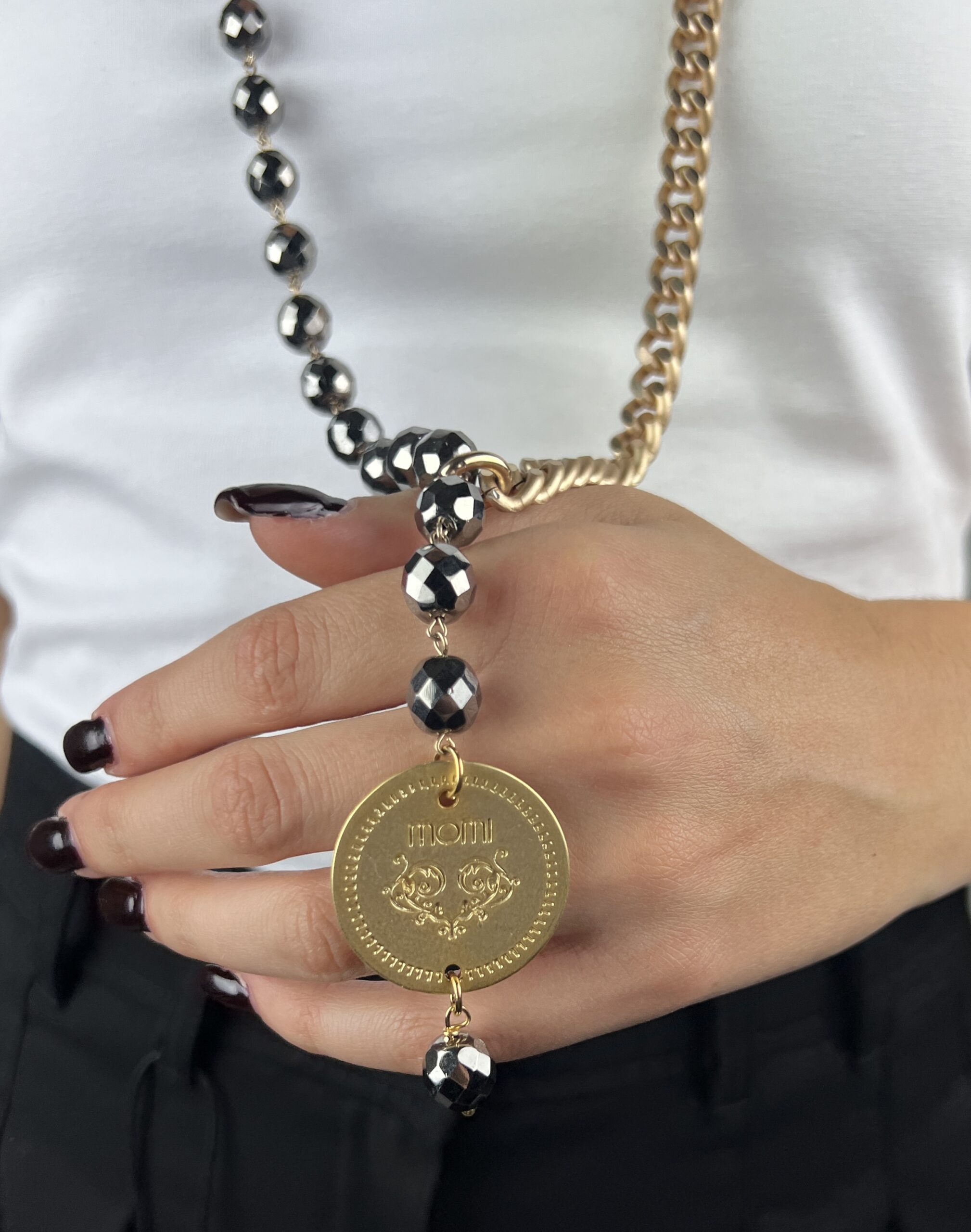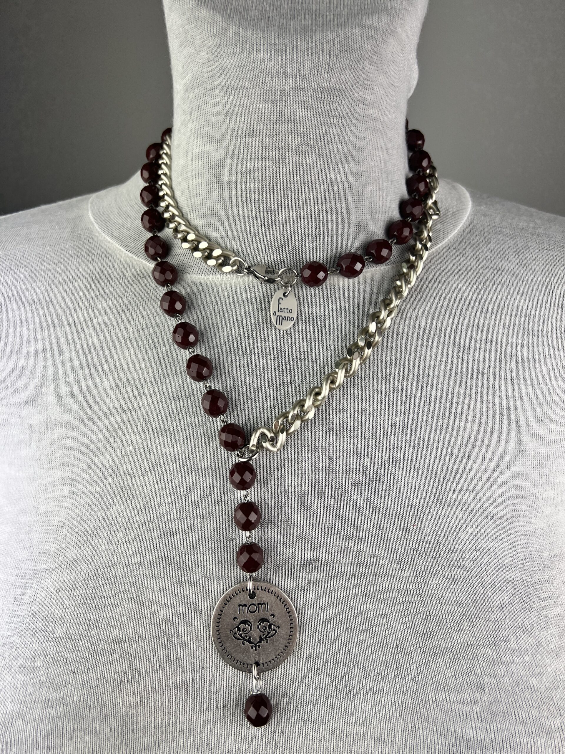 Collana con catena e cristalli. La catena è realizzata in alluminio anodizzato, mentre i mezzi cristalli di vetro hanno un diametro di 1cm e sono incatenati tra loro a mano con anelli in ottone galvanizzato. Il ciondolo è realizzato in zama pressofusa. La collana è chiusa da un moschettone in acciaio con l’inconfondibile ciondolo Momi in resina incisa. Lunghezza 105cm