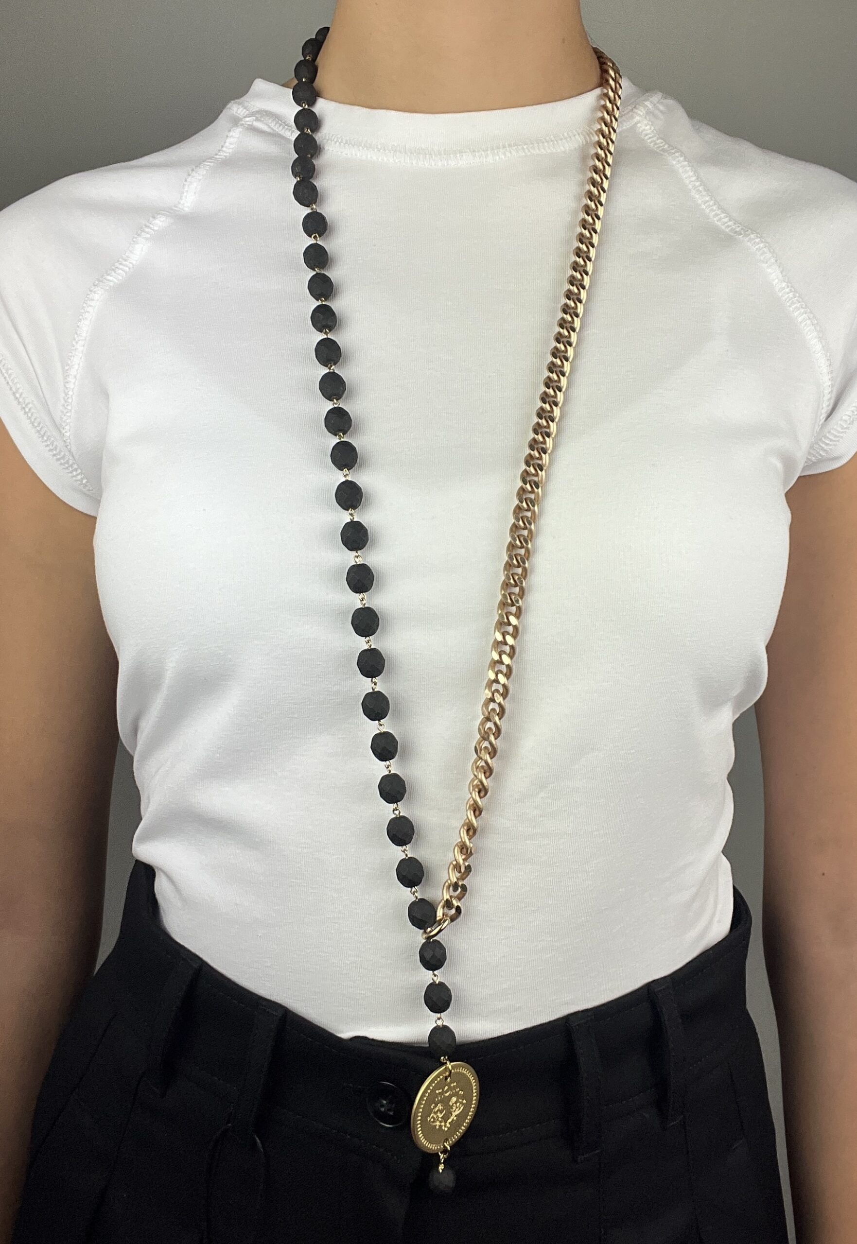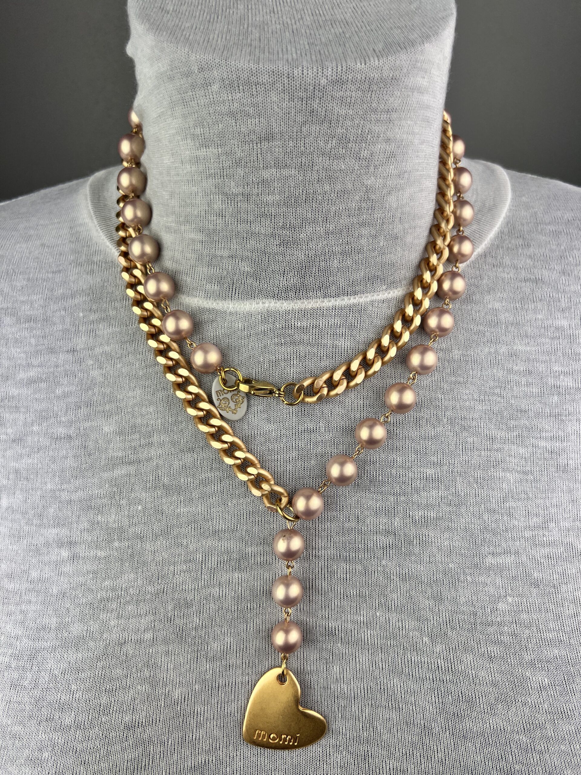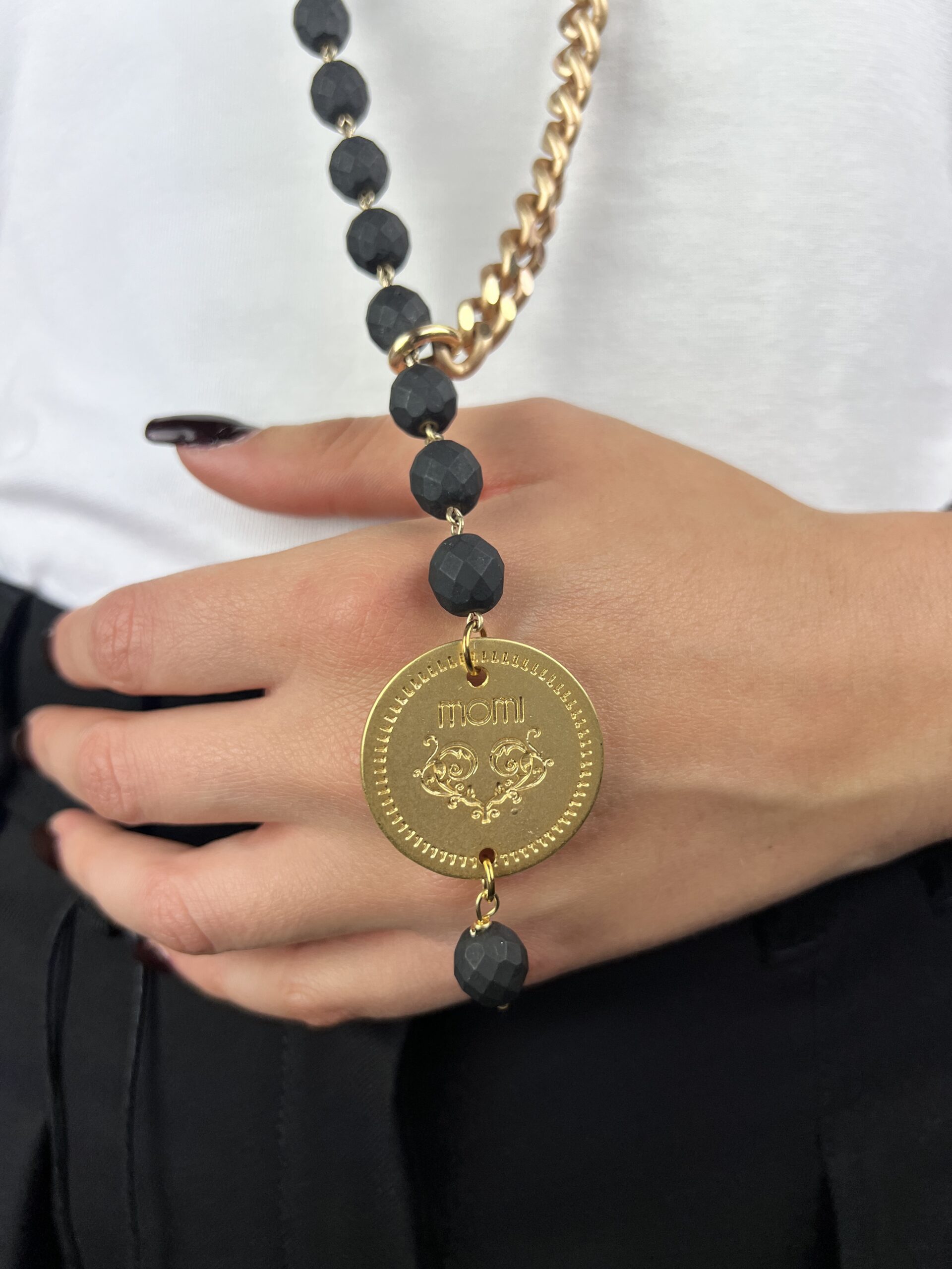 Collana con catena e cristalli. La catena è realizzata in alluminio anodizzato, mentre i mezzi cristalli di vetro hanno un diametro di 1cm e sono incatenati tra loro a mano con anelli in ottone galvanizzato. Il ciondolo è realizzato in zama pressofusa. La collana è chiusa da un moschettone in acciaio con l’inconfondibile ciondolo Momi in resina incisa. Lunghezza 105cm