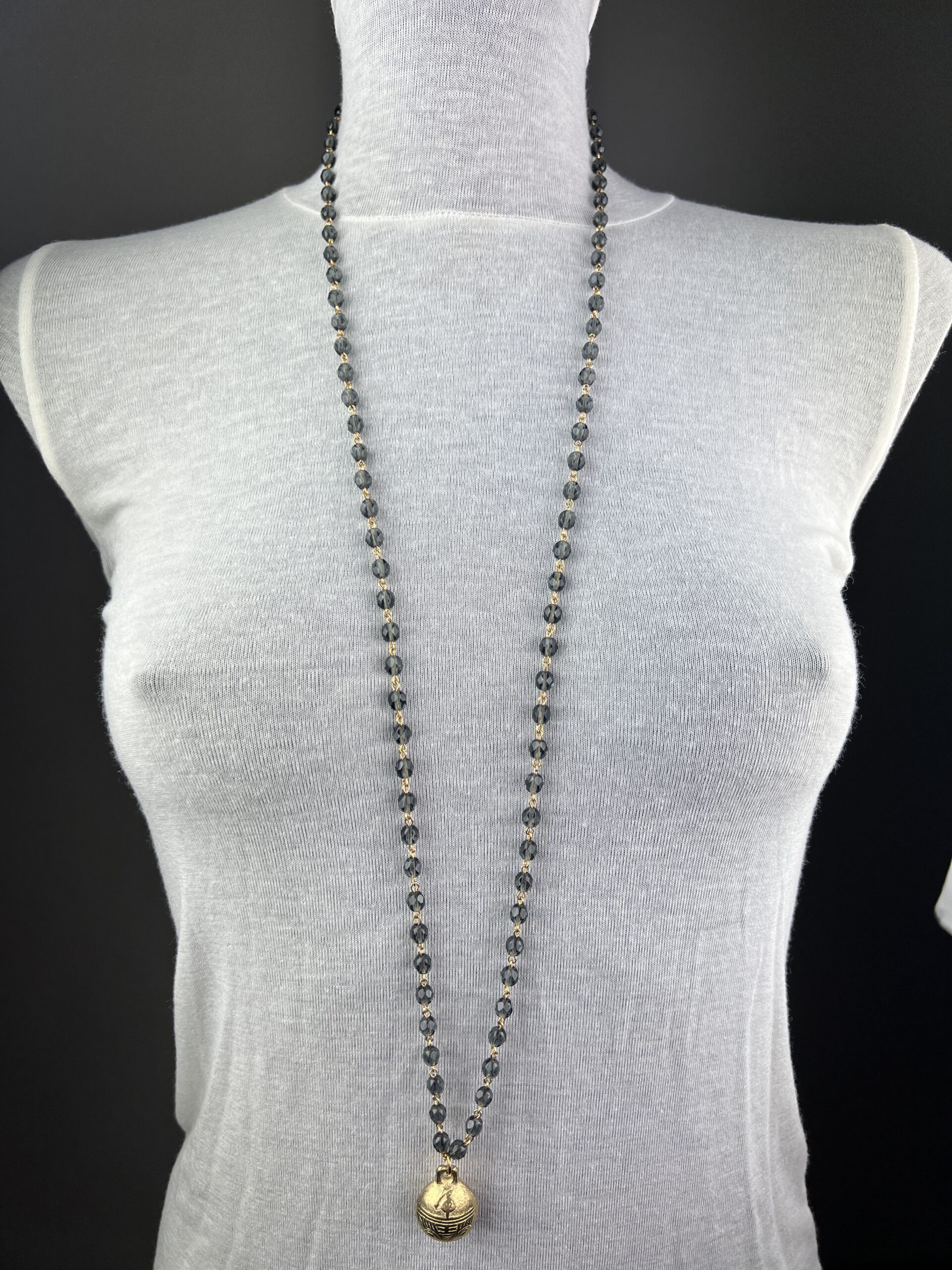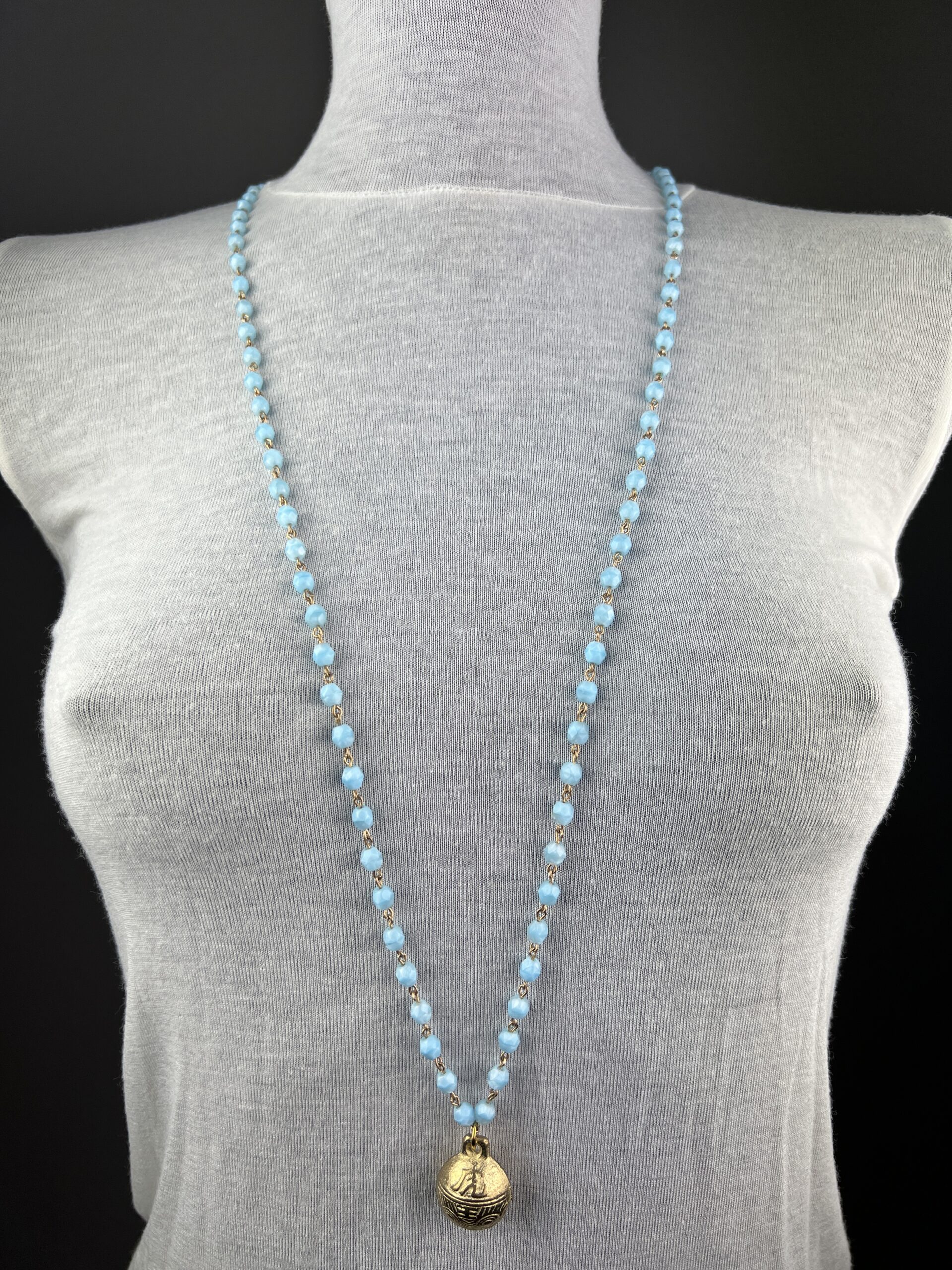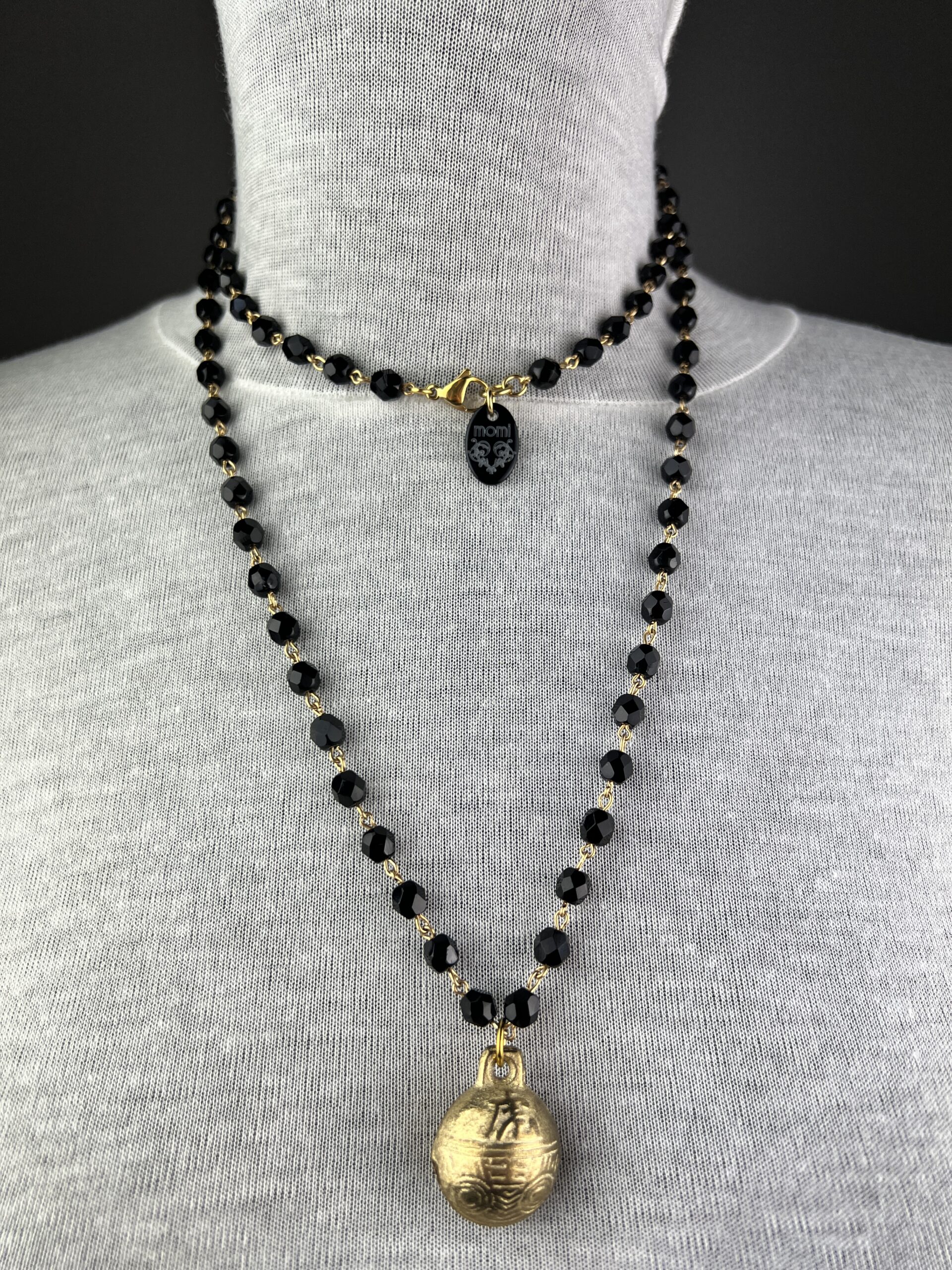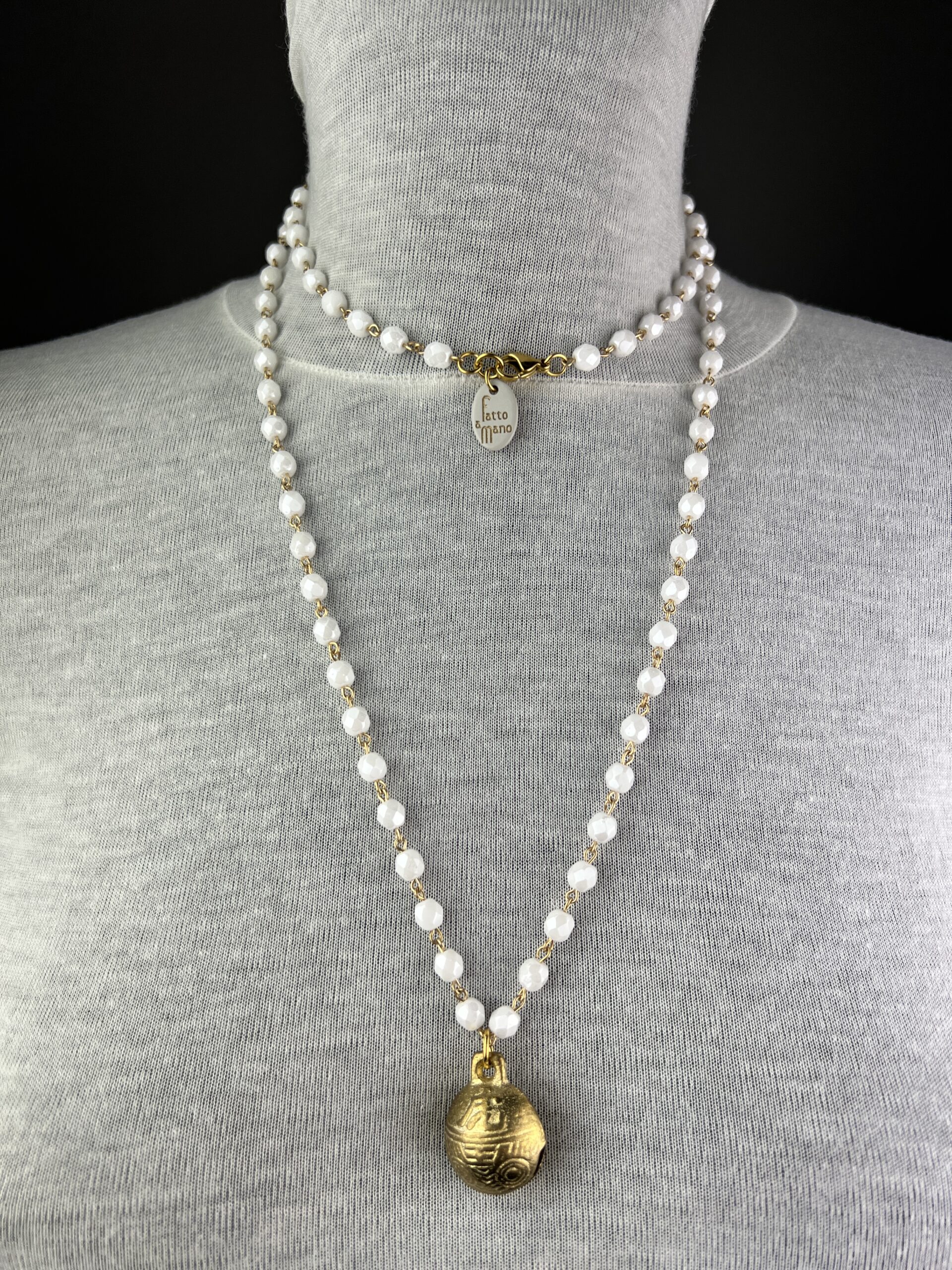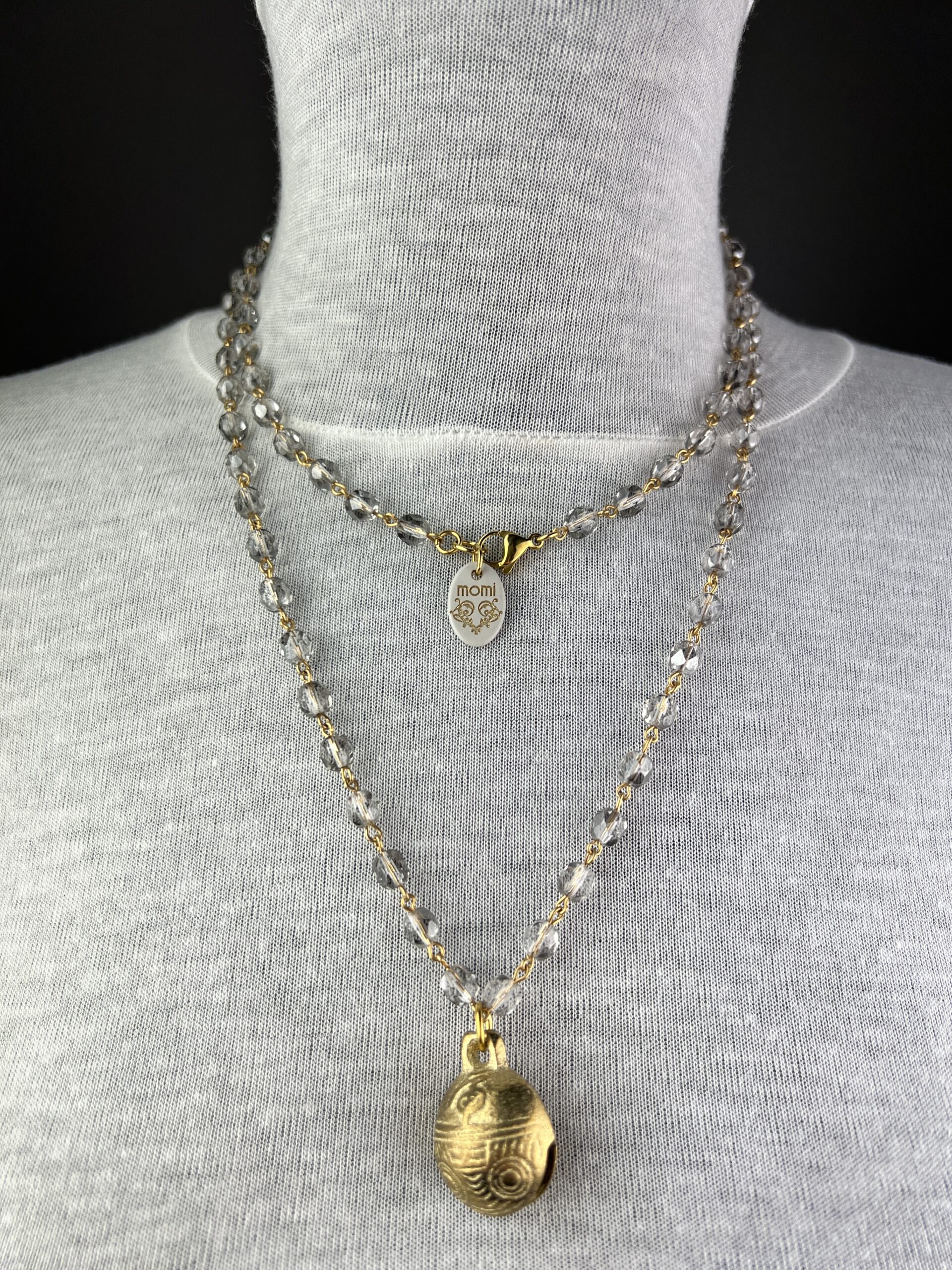 Collana con cristalli in vetro, ciondolo con sonaglio chiamangeli, chiusura con moschettone.