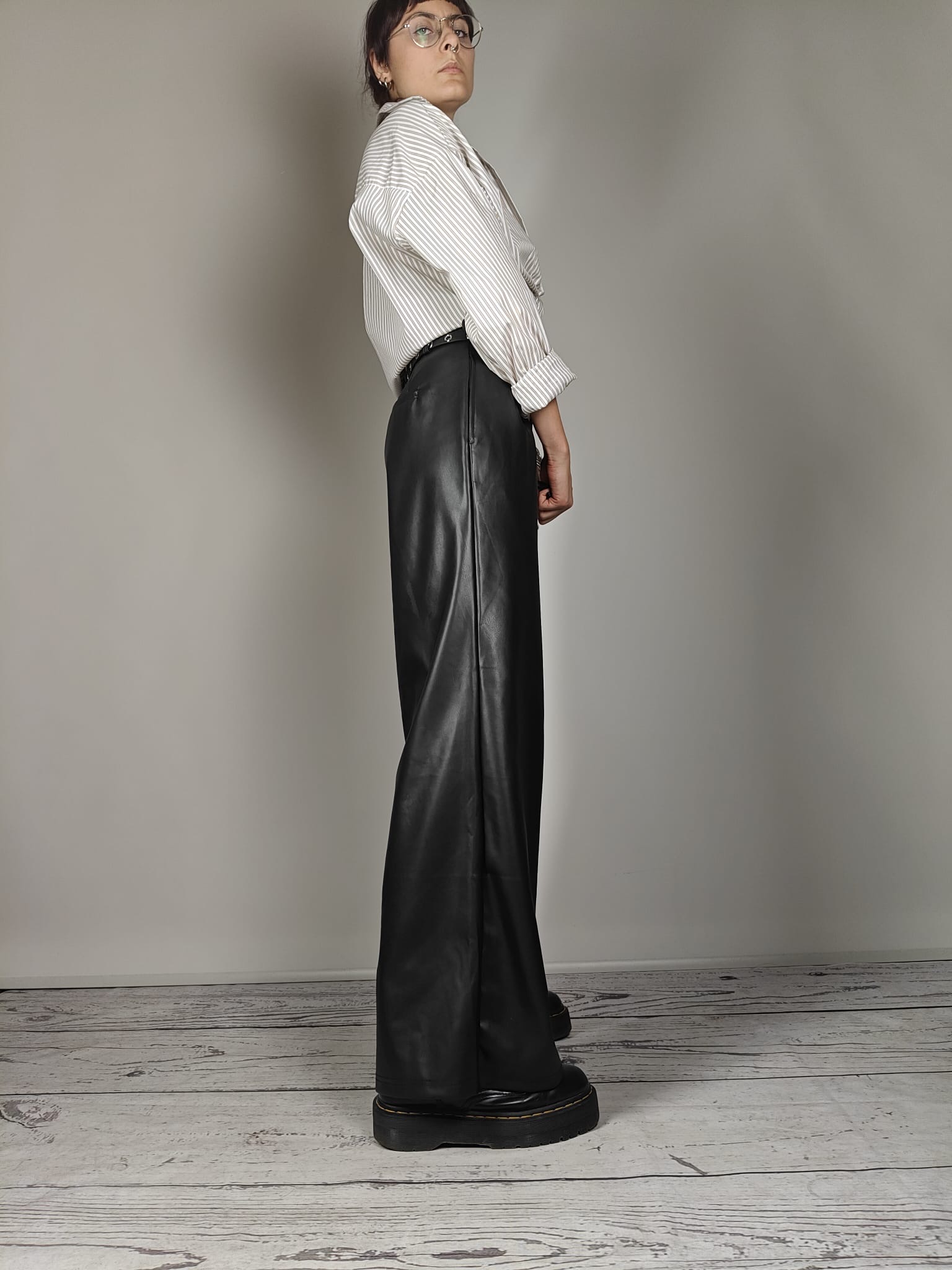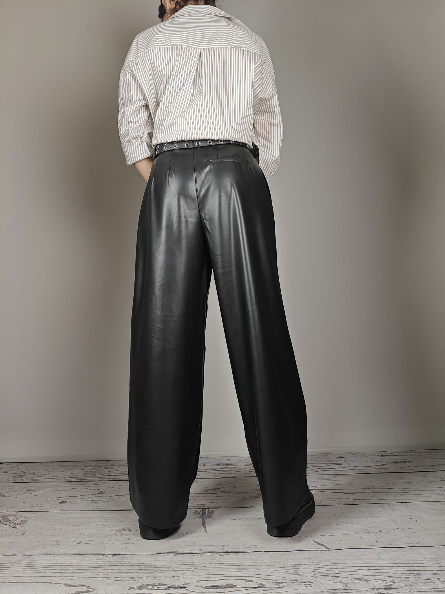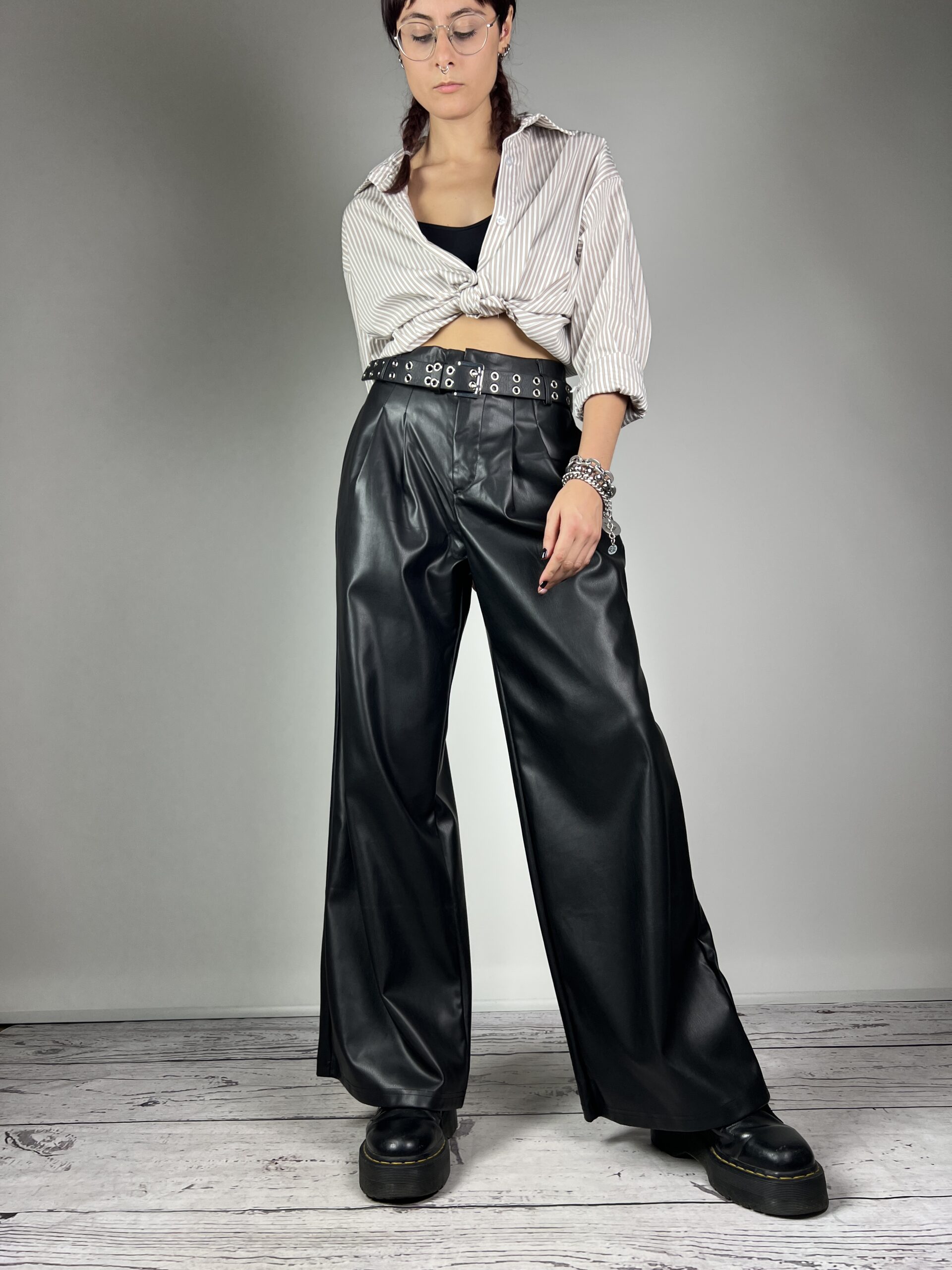 Pantaloni in simil pelle modello a palazzo Vita alta doppiata Chiusura con gancio a barretta e zip Doppi passanti Pinces sul davanti Tasche COMPOSIZIONE 100% P.U