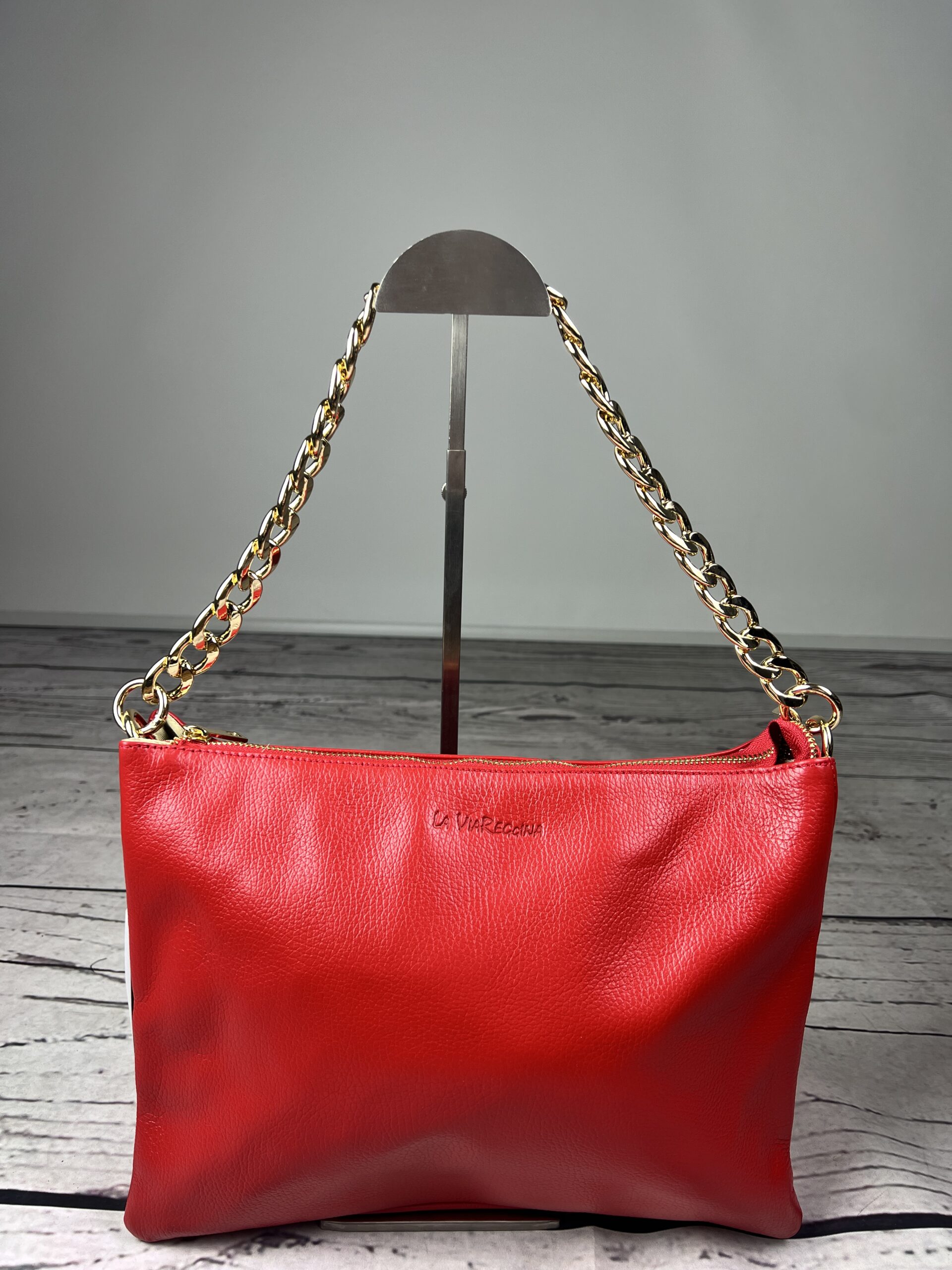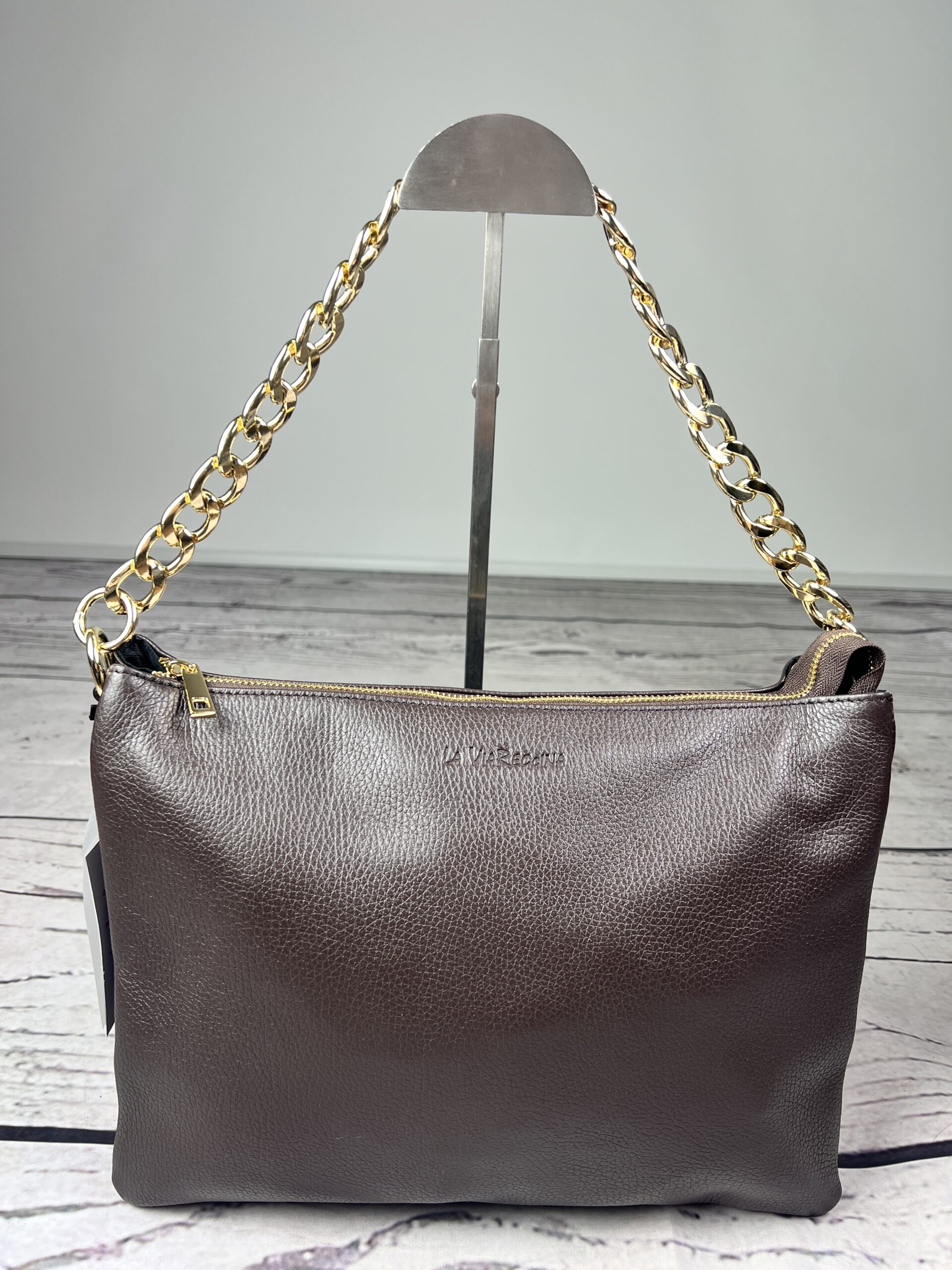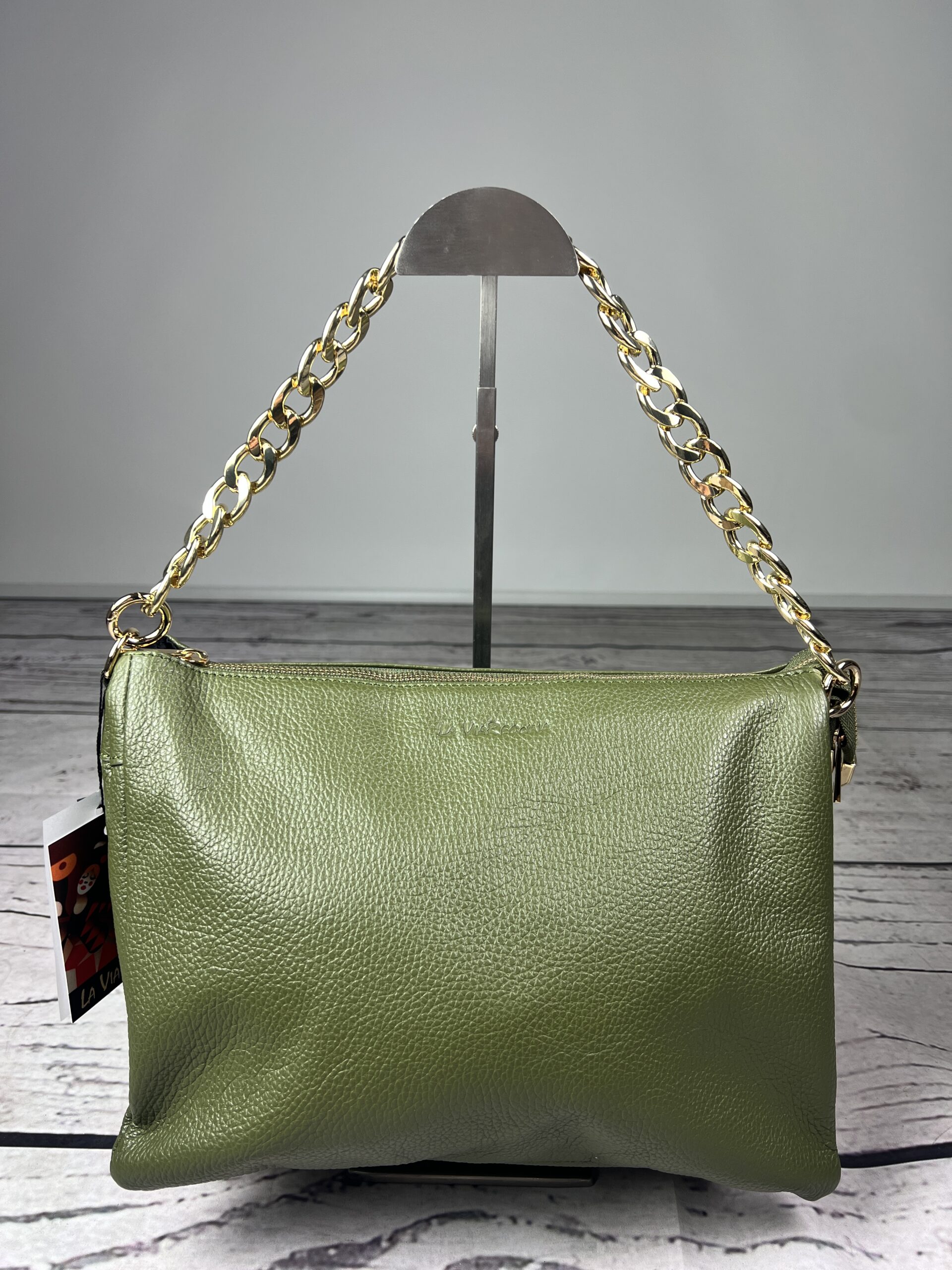 Borsa di alta qualità in vera pelle Made in Italy marchiata LA VIAREGGINA . Bag con tracolla e spallaccio a catena asportabili , design moderno e originale per una borsa pratica e capiente .Costruita con tre buste unite tra loro con chiusura zip . Misure cm 32×23.
