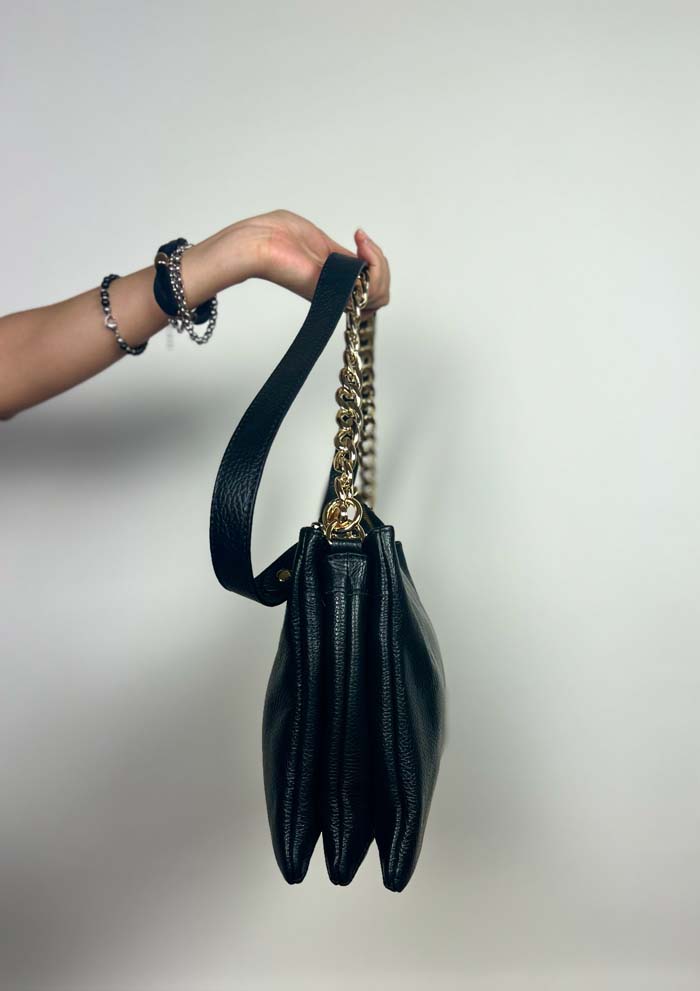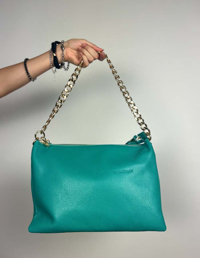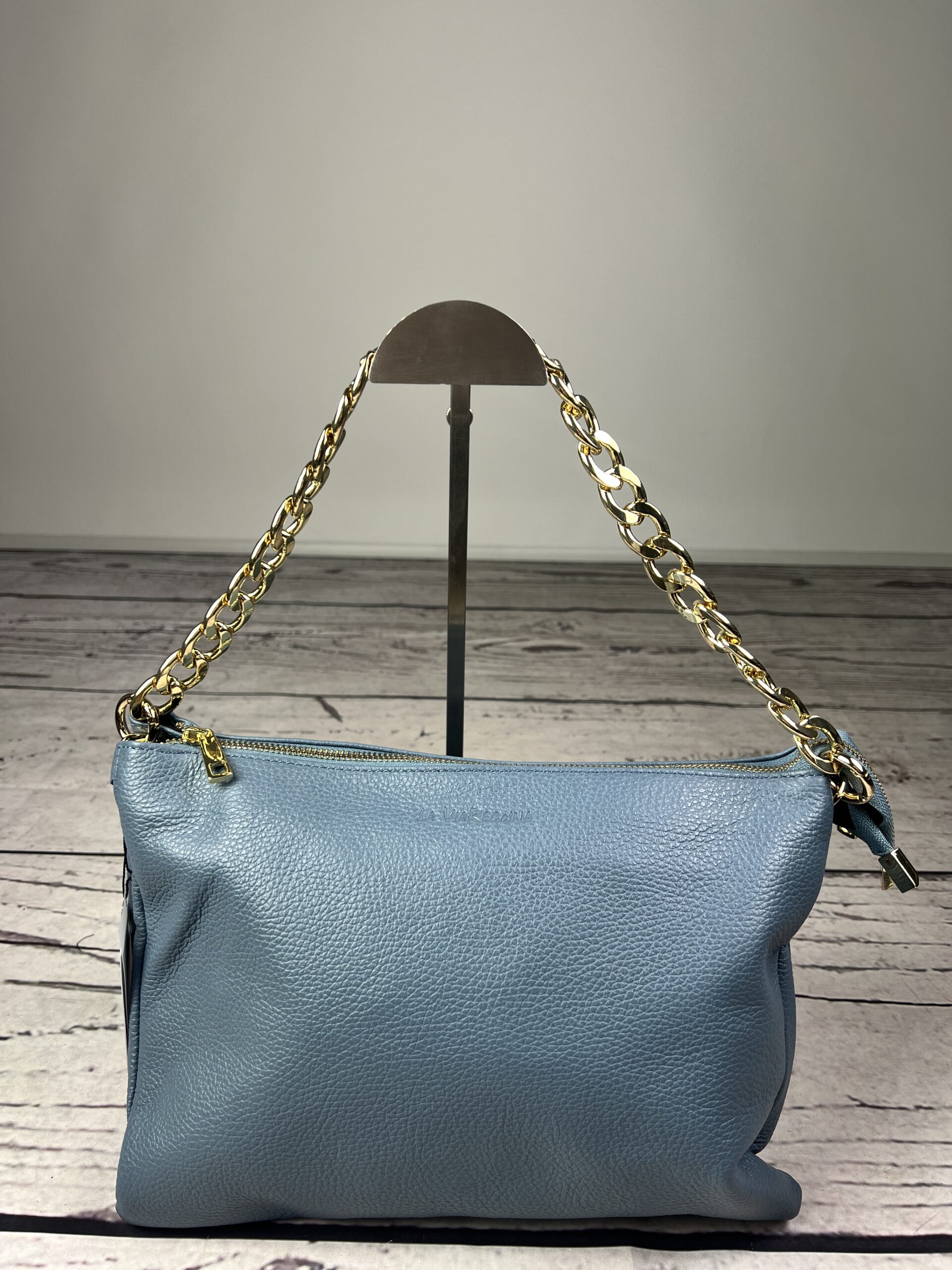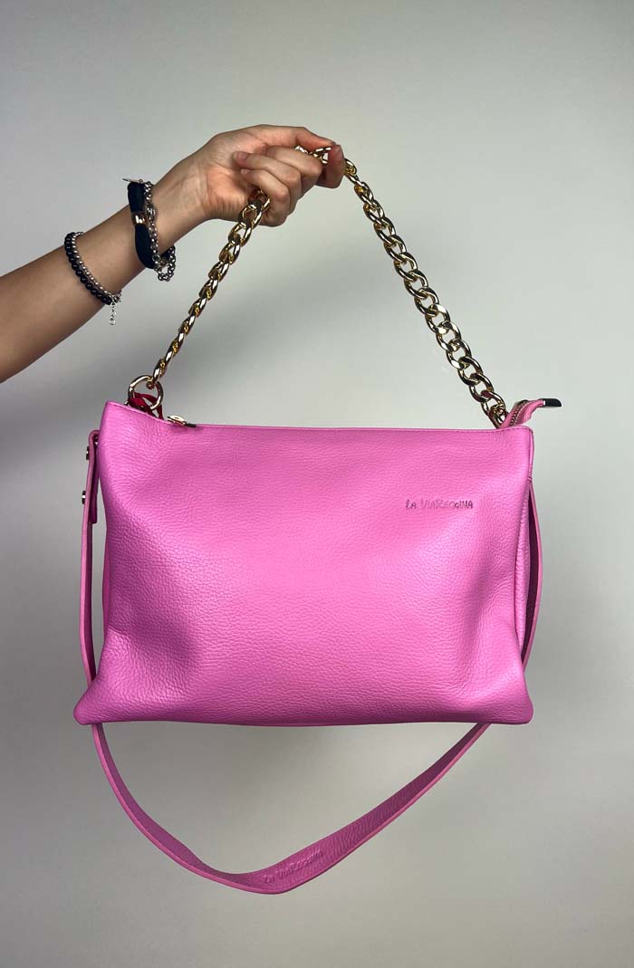 Borsa di alta qualità in vera pelle Made in Italy marchiata LA VIAREGGINA . Bag con tracolla e spallaccio a catena asportabili , design moderno e originale per una borsa pratica e capiente .Costruita con tre buste unite tra loro con chiusura zip . Misure cm 32×23.