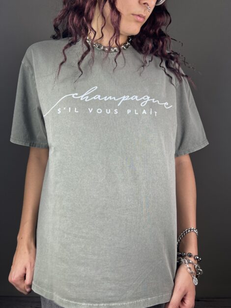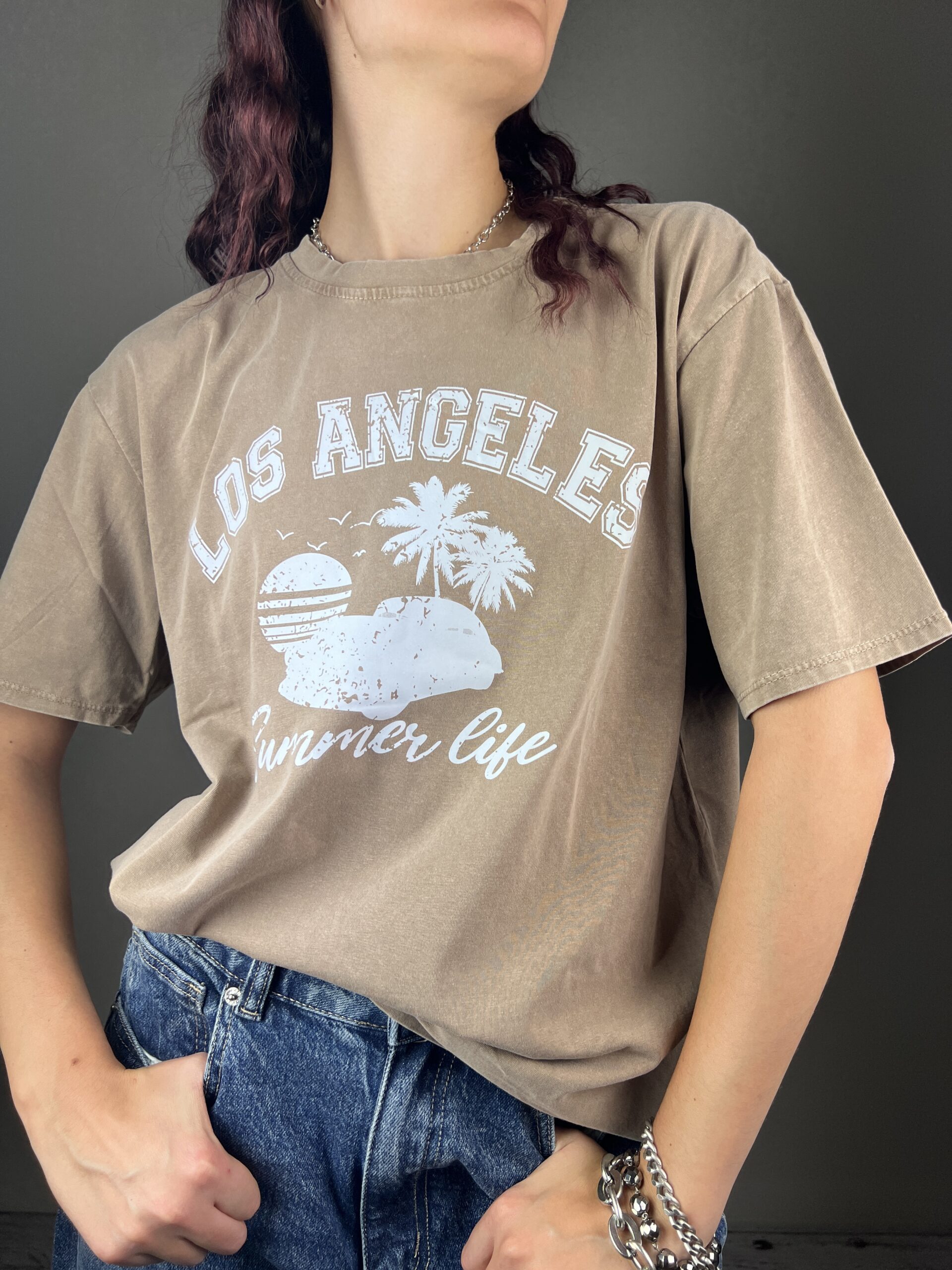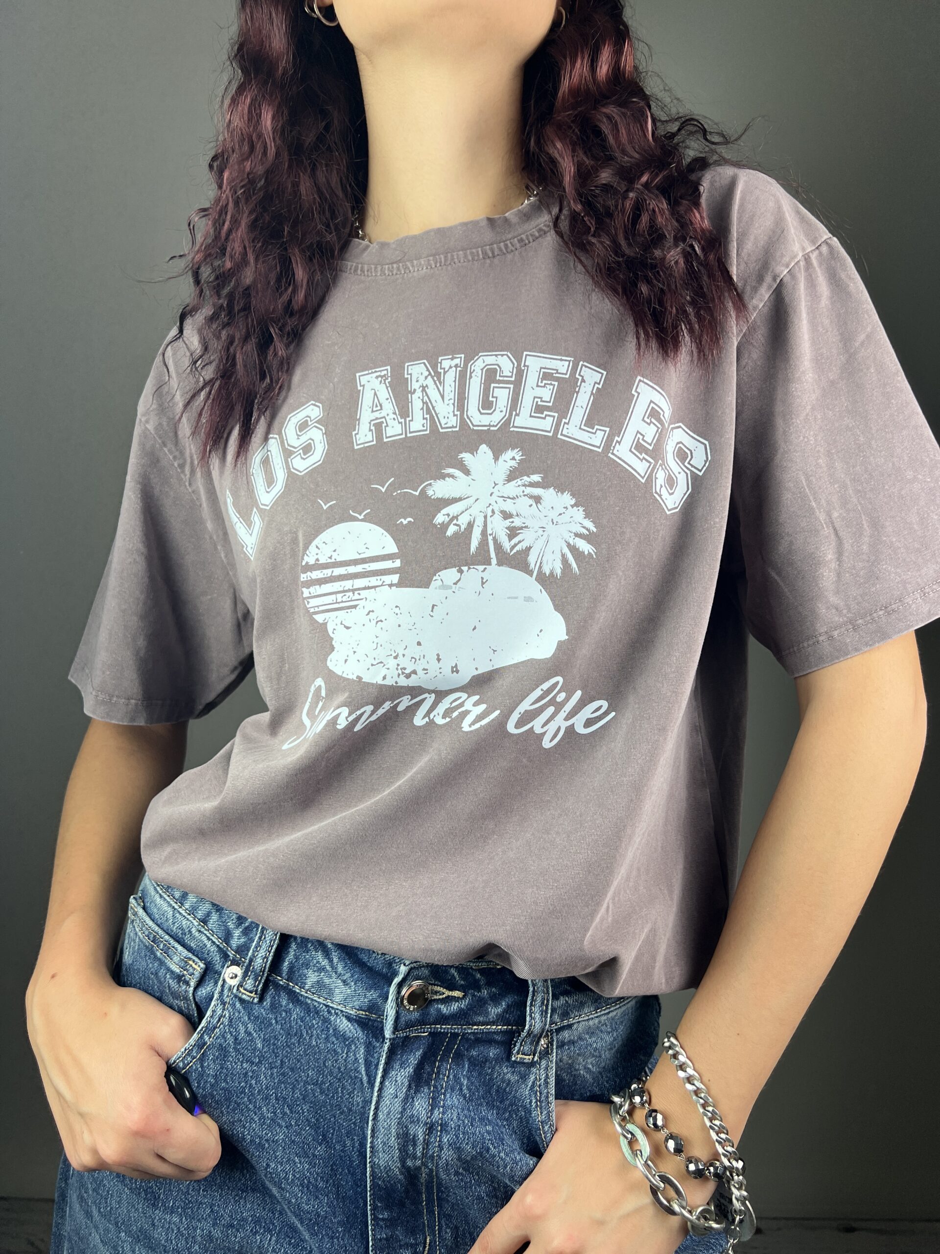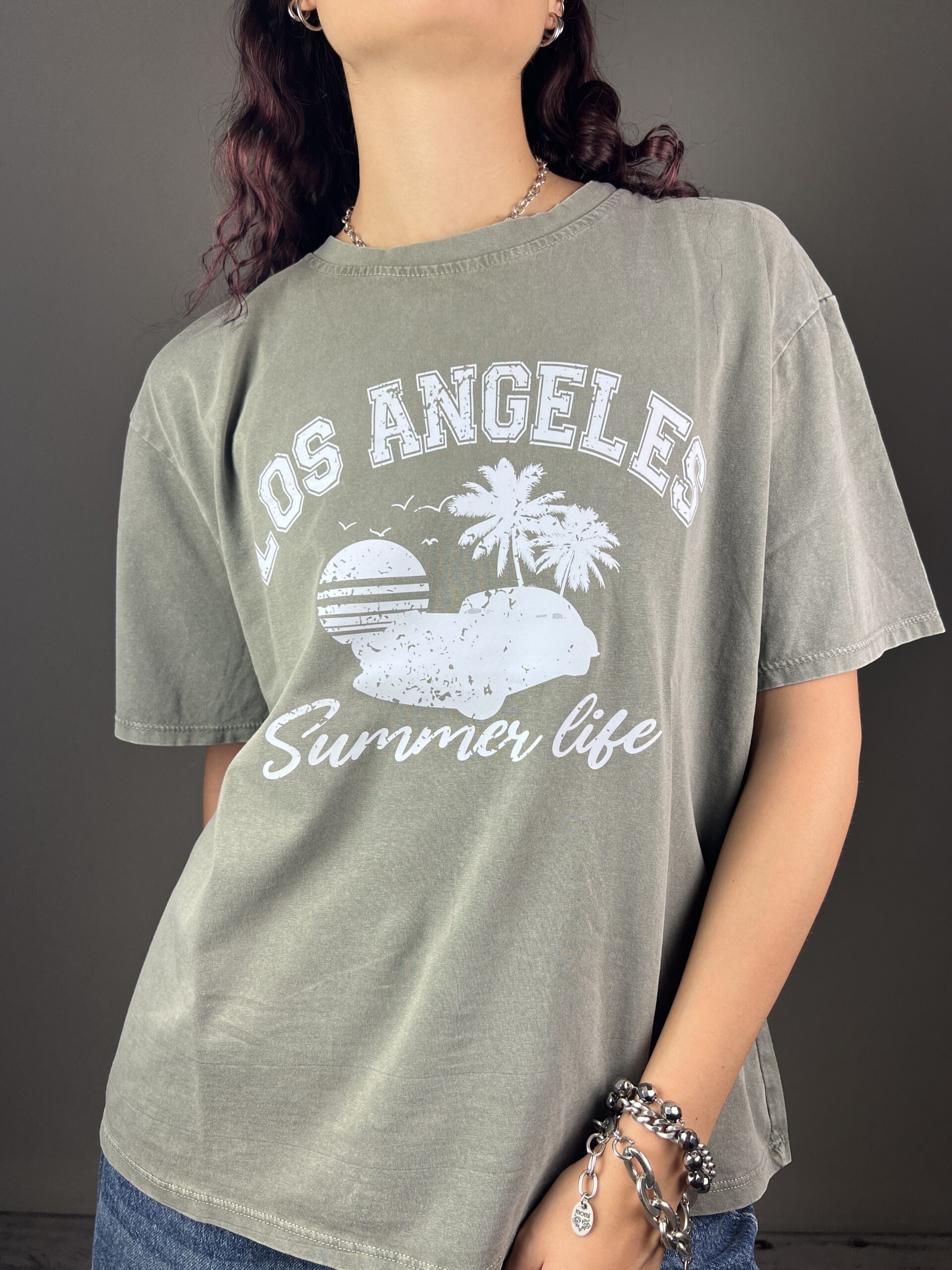 T-shirt 90% cotone 10% elastina, effetto delave. Girocollo, stampa. Taglia unica, vestibilità morbida.
